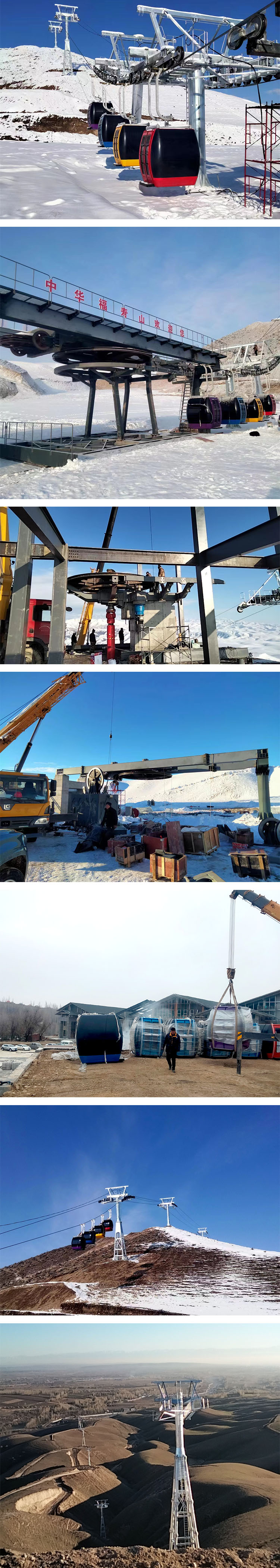 新疆中華福壽山滑雪場索道項目位于伊犁州霍城縣大西溝鄉境內,索道類型為單線循環固定抱索器脈動式八人吊箱;該索道總長度2160米,上下站高差325米,每小時運量600人,單向運行時間12.6分鐘,客運索道驗收投入運行后,能夠顯著提高中華福壽山滑雪場的接待能力,提升廣大滑雪愛好者的運動熱情,帶動周邊景區的旅游觀光人氣。
